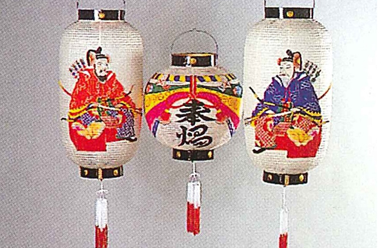 地張り提灯の特徴は、手作りによる丈夫さと源氏物語・武者絵などの色彩ゆたかな絵柄。