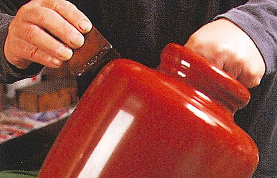 「根来塗」は黒漆の下地に朱色の漆を重ね、塗りの「研ぎ」の段階で、スルガ炭を使って所々を削り出す技法。