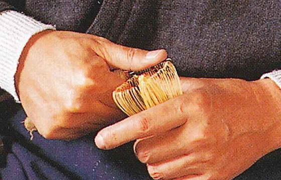 さらに穂先の両角を削る「面取り」をし、糸で穂の根元を編み、仕上げとなる。